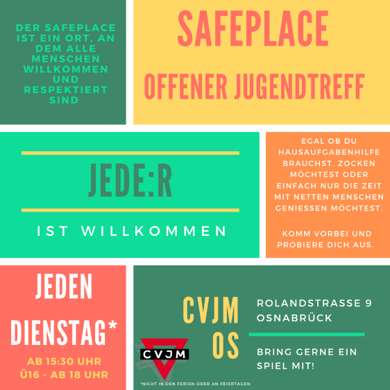 Der CVJM-SAFEPLACE bietet jungen Menschen einen Raum für Begegnung. Ihr könnt vorbei kommen und quatschen, zocken, snacken und vieles mehr. Auch Hilfe bei den Hausaufgaben können wir Euch anbieten.